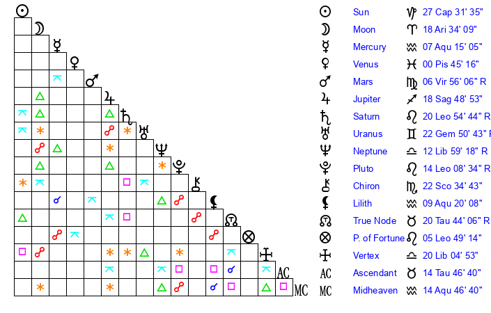| Moon | 18 Aries 35 | 24 Virgo 40 | 20 Aquarius 29 |