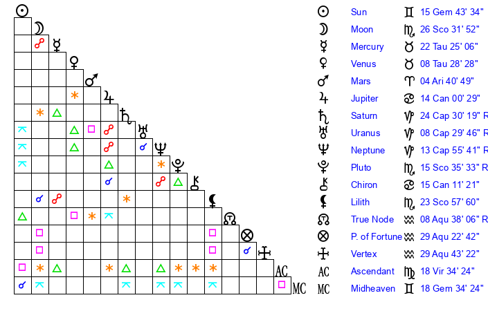 | Pluto | 15 Scorpio 35 | 3 Aquarius 34 | 15 Scorpio 1 |