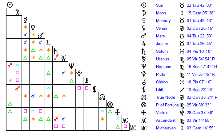 | Jupiter | 7 Taurus 18 | 23 Gemini 57 | 20 Taurus 4 |