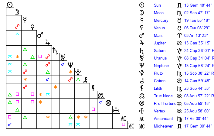 | Sun | 13 Gemini 48 | 14 Gemini 19 | 17 Cancer 13 |