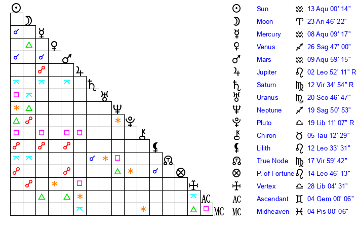 | Sun | 13 Aquarius 0 | 13 Aquarius 51 | 29 Pisces 14 |