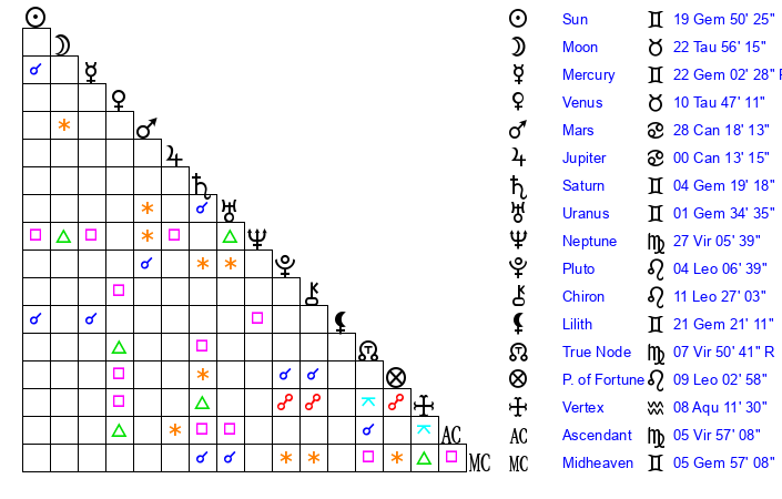Moon | 22 Taurus 50 | 21 Sagittarius 52 | 6 Gemini 48 |