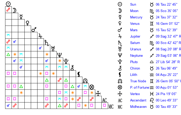 | Uranus | 8 Sagittarius 23 | 26 Taurus 7 | 6 Sagittarius 44 |