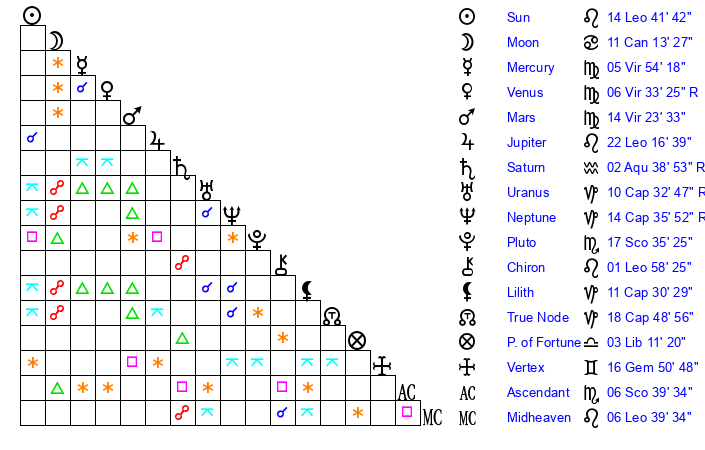 | Jupiter | 22 Leo 12 | 13 Cancer 8 | 29 Leo 35 |