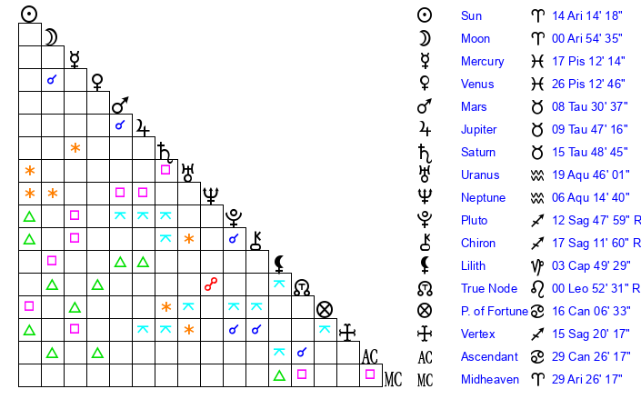 | Sun | 14 Aries 15 | 14 Aries 11 | 8 Taurus 42 |