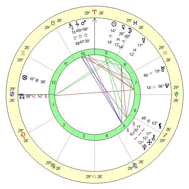 | Moon | 0 Aries 54 | 26 Gemini 40 | 29 Aquarius 43 |