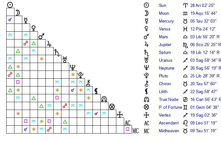 Sun | 28 Aries 3 | 28 Aries 37 | 9 Gemini 38 |