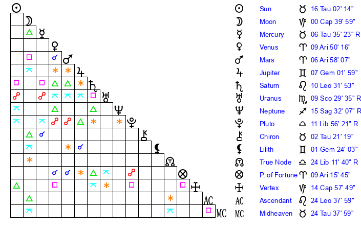 | Sun | 16 Taurus 2 | 16 Taurus 25 | 2 Cancer 6 |