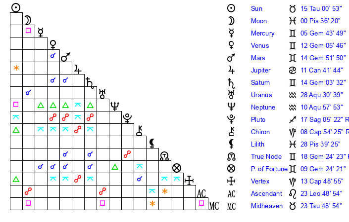 Sun | 15 Taurus 1 | 15 Taurus 27 | 7 Gemini 11 |