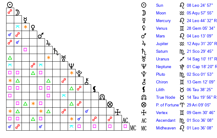 | Saturn | 21 Scorpio 48 | 1 Aries 31 | 23 Scorpio 24 |