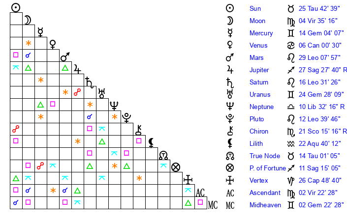 | Moon | 4 Virgo 41 | 10 Capricorn 50 | 21 Gemini 27 |