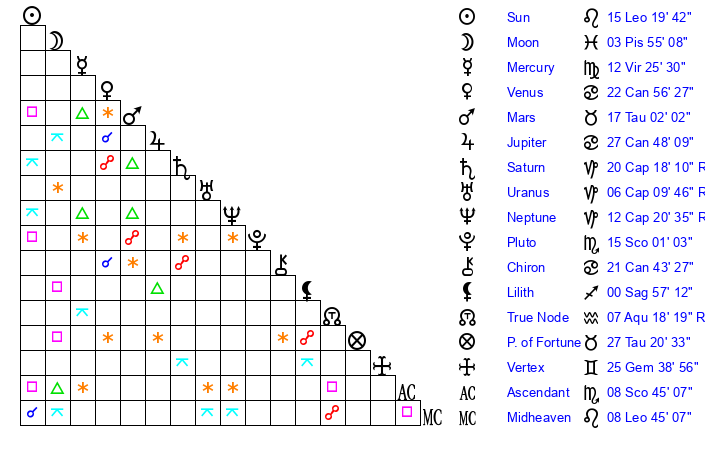 | Mercury | 12 Virgo 25 | 4 Leo 47 | 11 Virgo 43 |