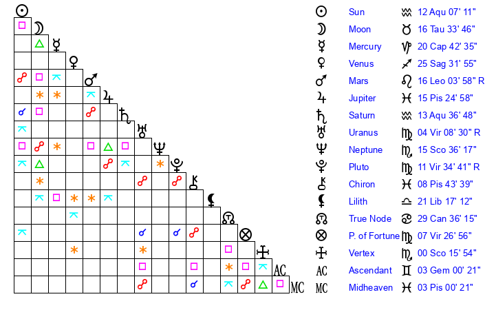 | Pluto | 11 Virgo 34 | 2 Aquarius 4 | 10 Virgo 3 |