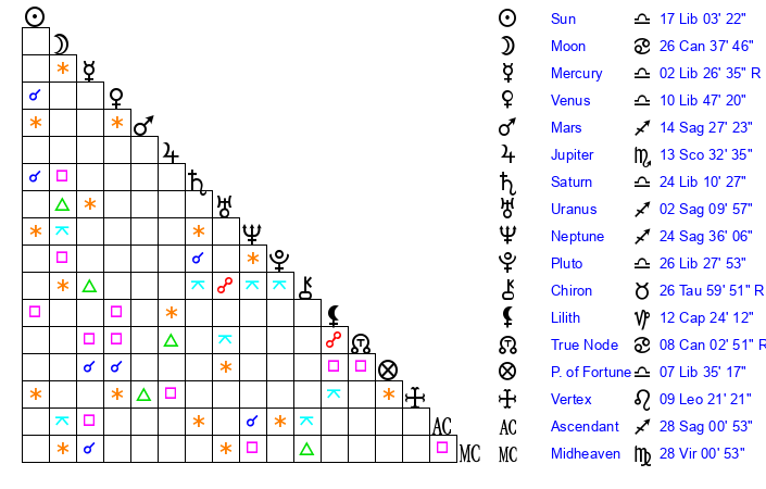 | Saturn | 24 Libra 31 | 26 Pisces 56 | 29 Libra 37 |