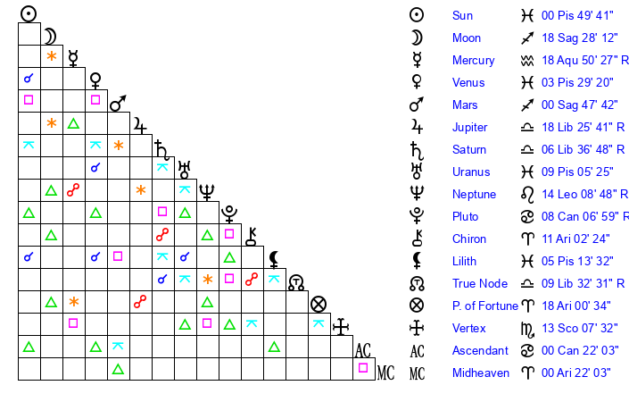 | Neptune | 15 Leo 27 | 29 Pisces 30 | 13 Leo 11 |