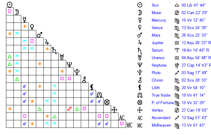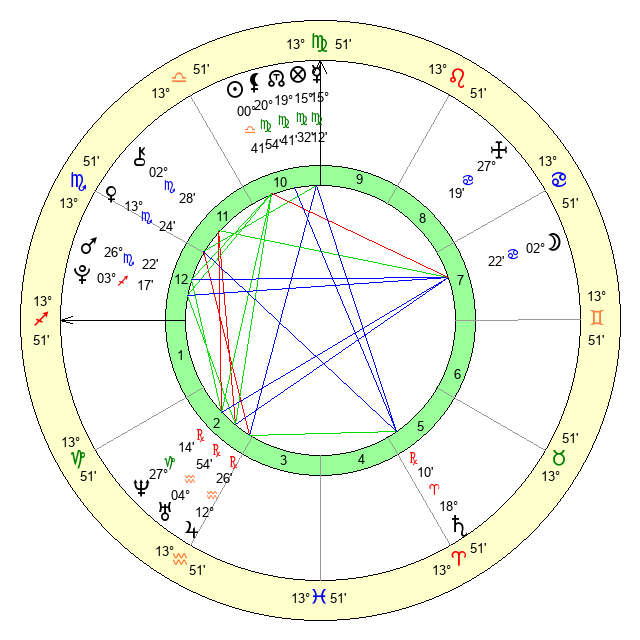 Venus | 13 Scorpio 25 | 5 Virgo 7 | 14 Sagittarius 40 |