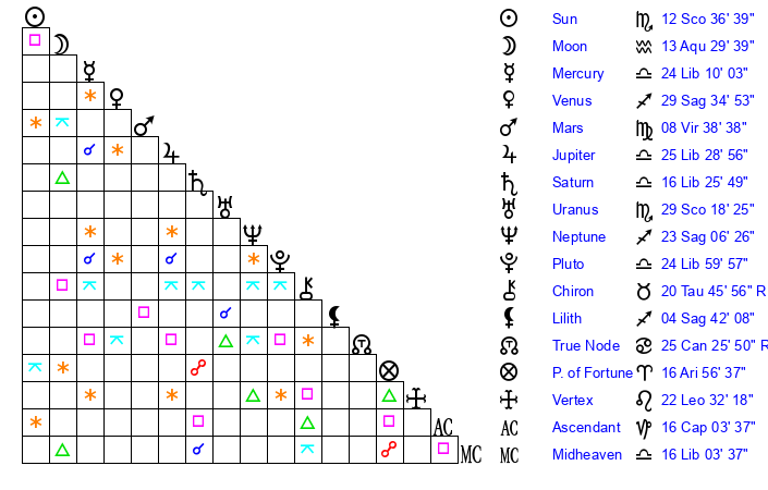 | Sun | 12 Scorpio 37 | 13 Scorpio 11 | 26 Sagittarius 6 |