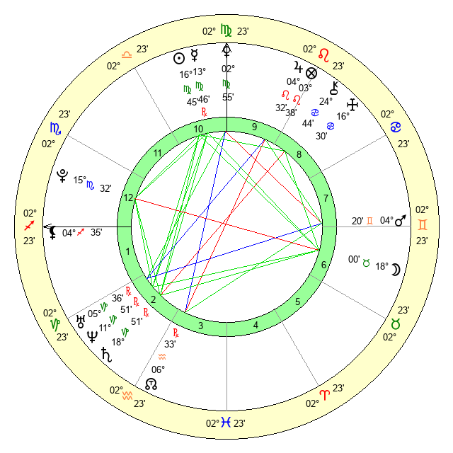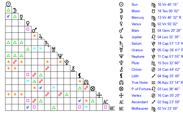 | Sun | 16 Virgo 45 | 17 Virgo 16 | 21 Libra 5 |
