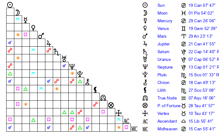 | Moon | 1 Pisces 56 | 29 Capricorn 53 | 19 Gemini 40 |