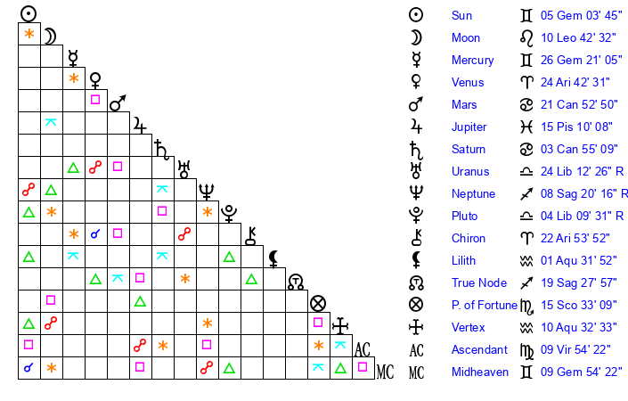 | Sun | 5 Gemini 3 | 5 Gemini 42 | 23 Cancer 46 |