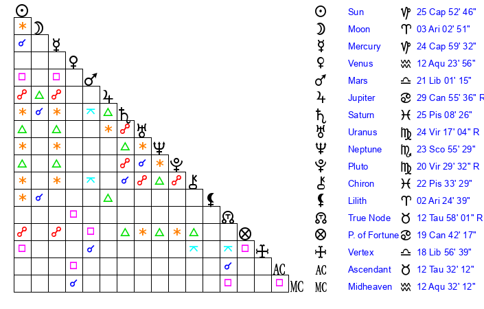 Mercury | 25 Capricorn 0 | 12 Capricorn 9 | 4 Pisces 43 |