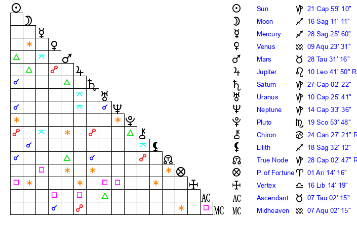 | Sun | 21 Capricorn 59 | 22 Capricorn 45 | 26 Aquarius 30 |