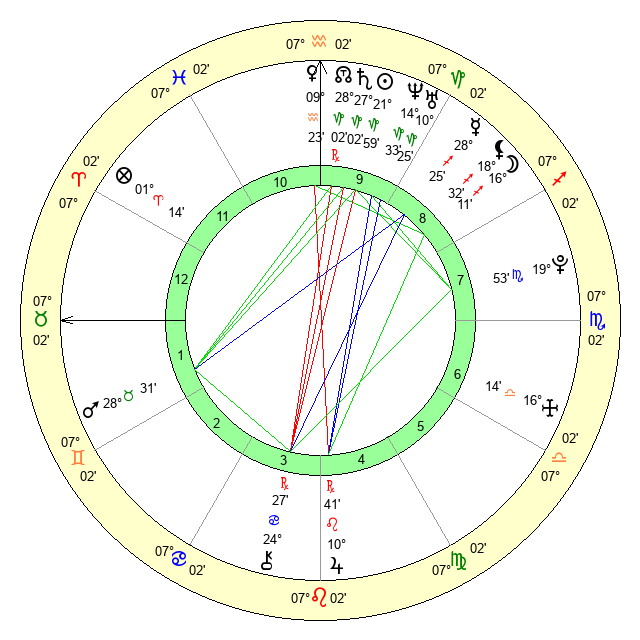 | Moon | 16 Sagittarius 9 | 7 Cancer 18 | 8 Pisces 6 |