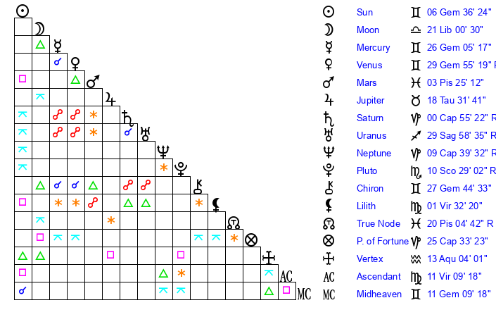 | Venus | 29 Gemini 54 | 20 Aries 52 | 13 Gemini 56 |