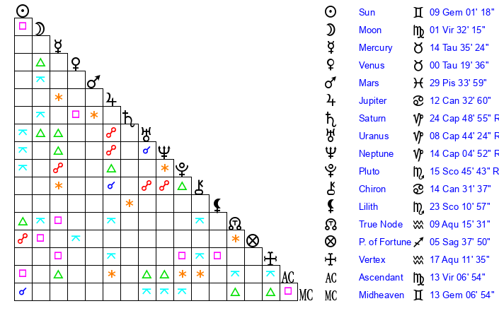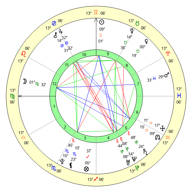 | Moon | 1 Virgo 38 | 28 Cancer 11 | 5 Sagittarius 10 |
