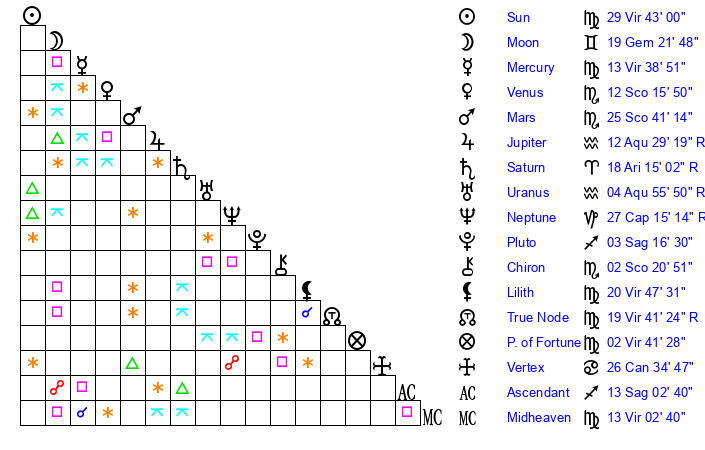 Moon | 19 Gemini 26 | 9 Libra 47 | 27 Gemini 58 |