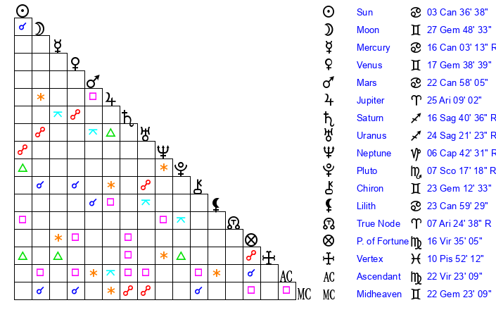 | Sun | 3 Cancer 36 | 4 Cancer 23 | 9 Leo 52 |