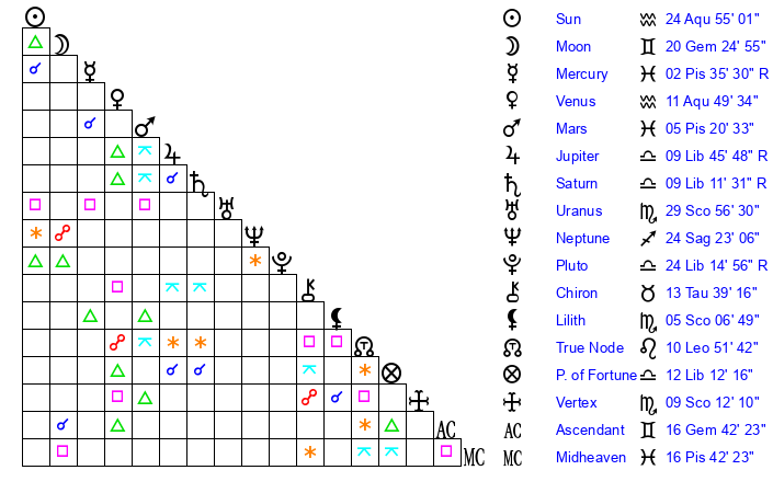 | Mercury | 2 Pisces 35 | 28 Aquarius 33 | 14 Pisces 47 |