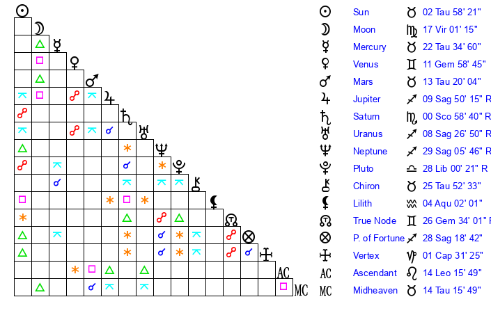 | Mercury | 22 Taurus 35 | 6 Aries 36 | 20 Taurus 13 |