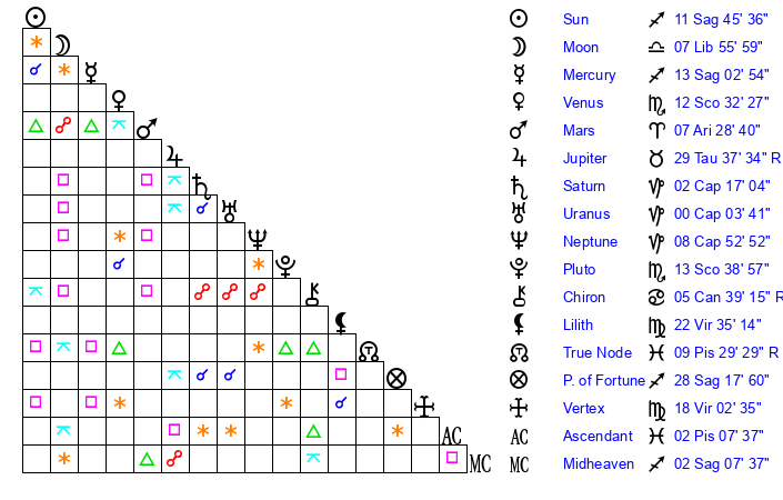| Moon | 7 Libra 54 | 23 Taurus 50 | 14 Aquarius 29 |