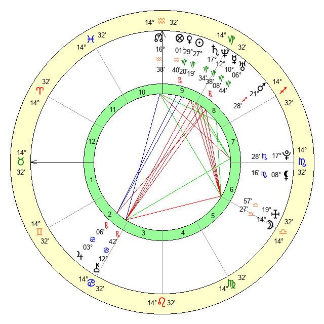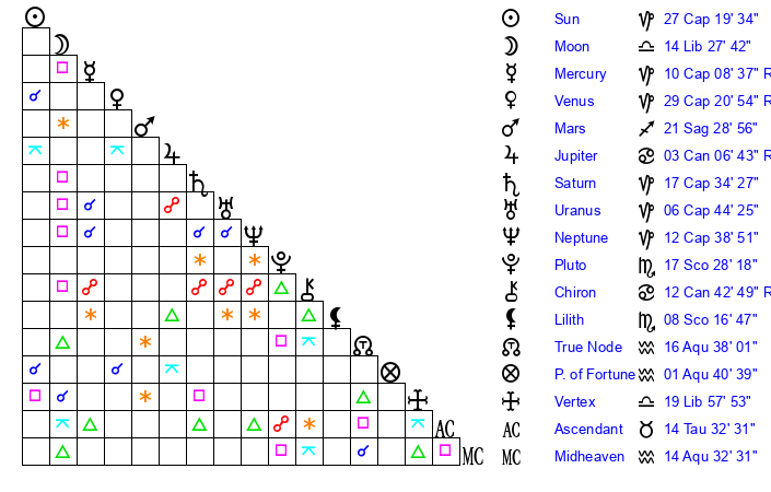 | Moon | 14 Libra 25 | 12 Virgo 30 | 16 Capricorn 59 |