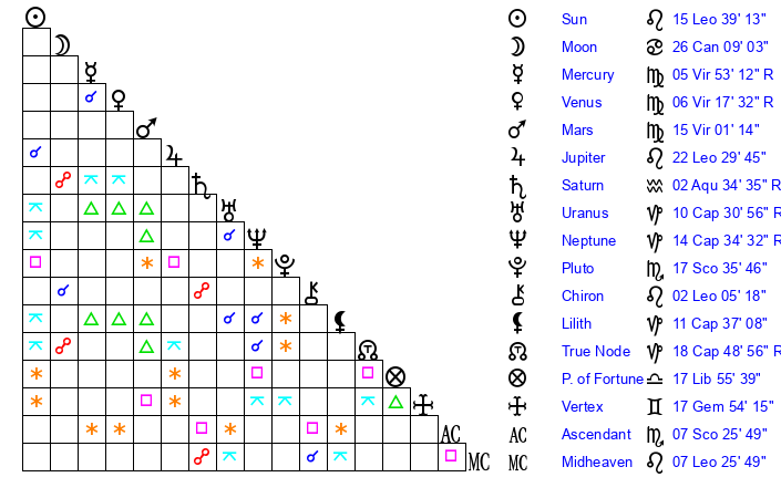 | Mercury | 5 Virgo 53 | 4 Leo 37 | 1 Virgo 20 |