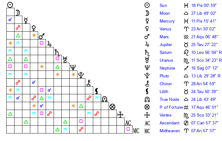 | Moon | 27 Libra 43 | 13 Cancer 43 | 24 Cancer 50 |