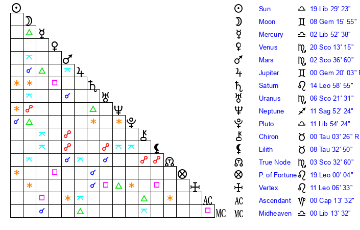 | Pluto | 11 Libra 55 | 1 Aquarius 21 | 13 Libra 34 |