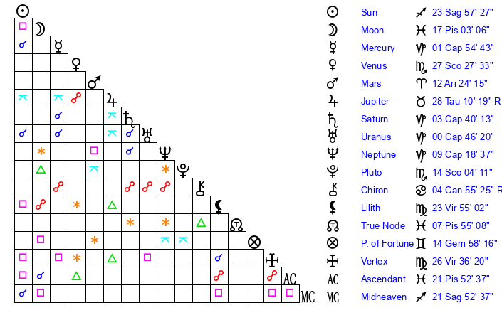 | Sun | 23 Sagittarius 57 | 23 Sagittarius 58 | 1 Aquarius 39 |