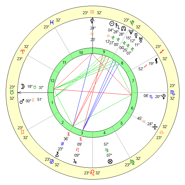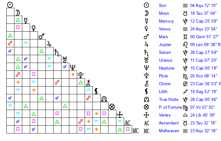 | Moon | 18 Taurus 46 | 6 Sagittarius 16 | 24 Leo 54 |