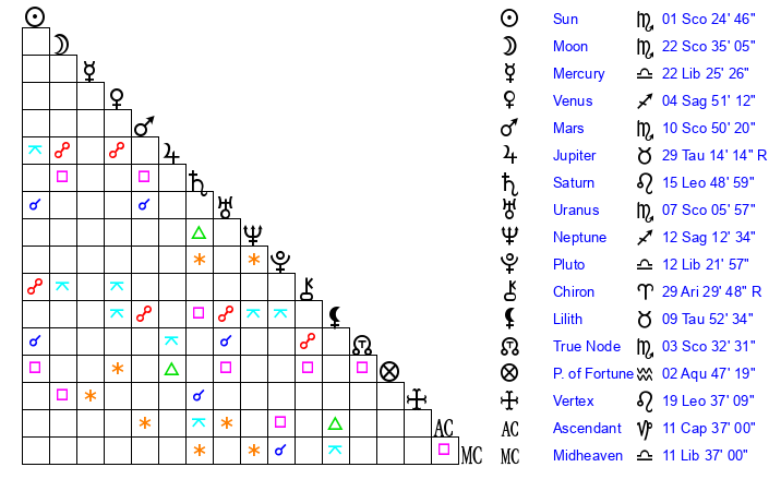 | Moon | 22 Scorpio 26 | 6 Sagittarius 19 | 29 Leo 26 |