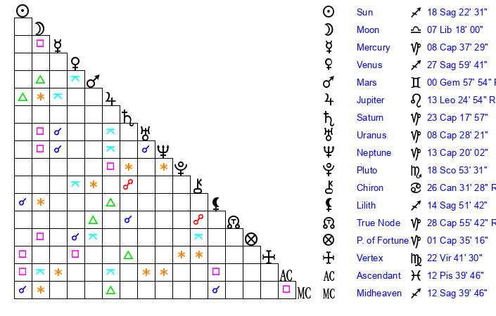 | Venus | 28 Sagittarius 0 | 12 Sagittarius 25 | 11 Aquarius 54 |
