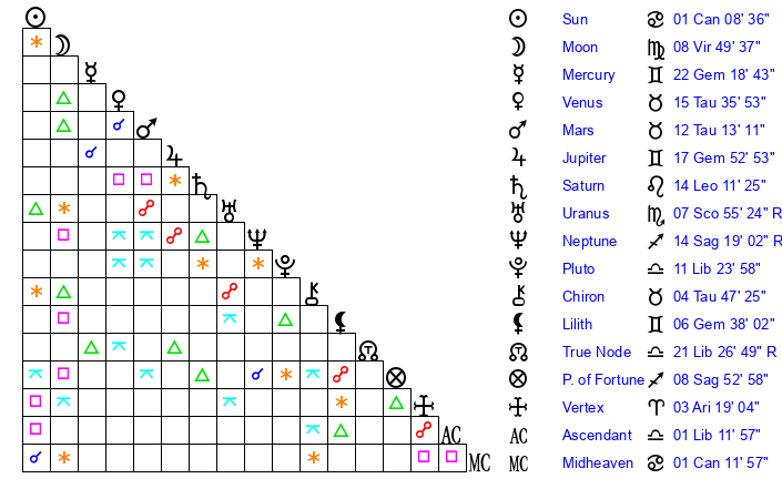 | Mercury | 22 Gemini 19 | 24 Cancer 17 | 14 Virgo 18 |