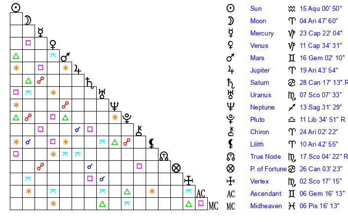 | Sun | 15 Aquarius 0 | 16 Aquarius 8 | 4 Aries 11 |