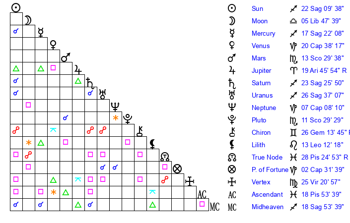 | Saturn | 23 Sagittarius 35 | 25 Pisces 18 | 27 Sagittarius 55 |
