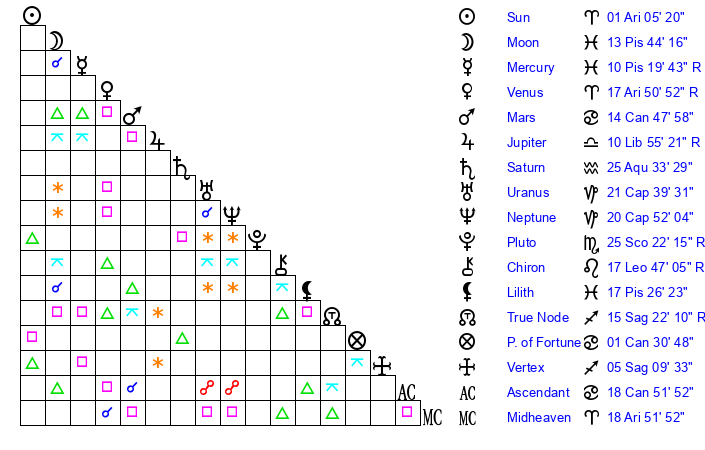 | Mercury | 10 Pisces 19 | 6 Aries 59 | 10 Aries 26 |