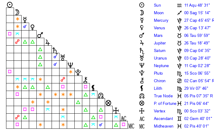| Venus | 26 Capricorn 14 | 27 Pisces 13 | 11 Pisces 14 |