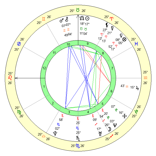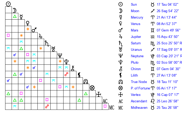 | Moon | 26 Sagittarius 54 | 22 Virgo 58 | 5 Gemini 12 |