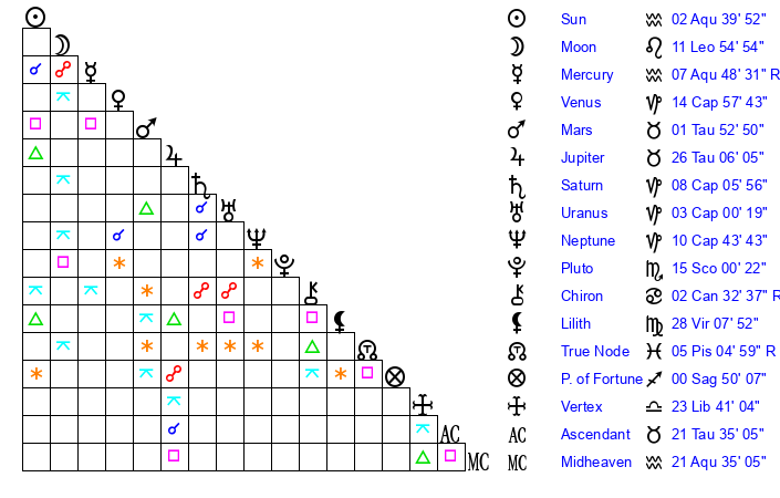 | Venus | 14 Capricorn 58 | 19 Pisces 29 | 0 Pisces 0 |