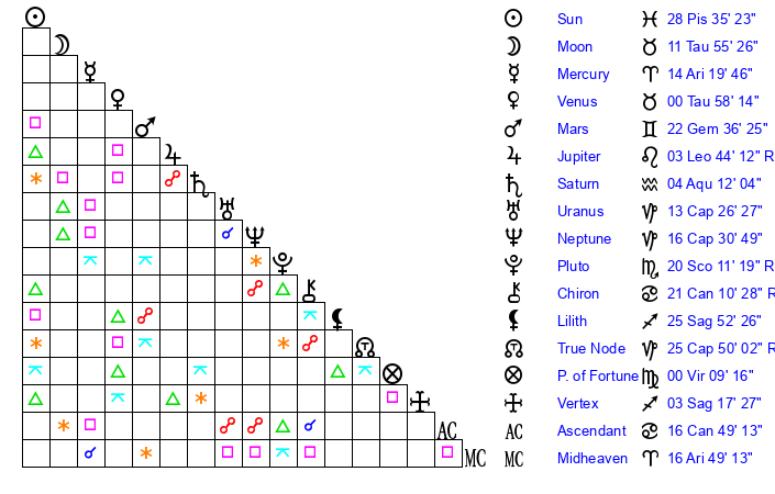 | Moon | 11 Taurus 56 | 28 Scorpio 12 | 17 Leo 19 |